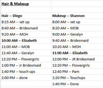 Below you’ll find some important information for the weekend. If you have any questions, please call or text Kirsten Westerlund of Olive Fine Weddings & Events at 219-242-4580. She is the planner and point of contact for the weekend. Thank you for all you do to support Elizabeth + Matt!