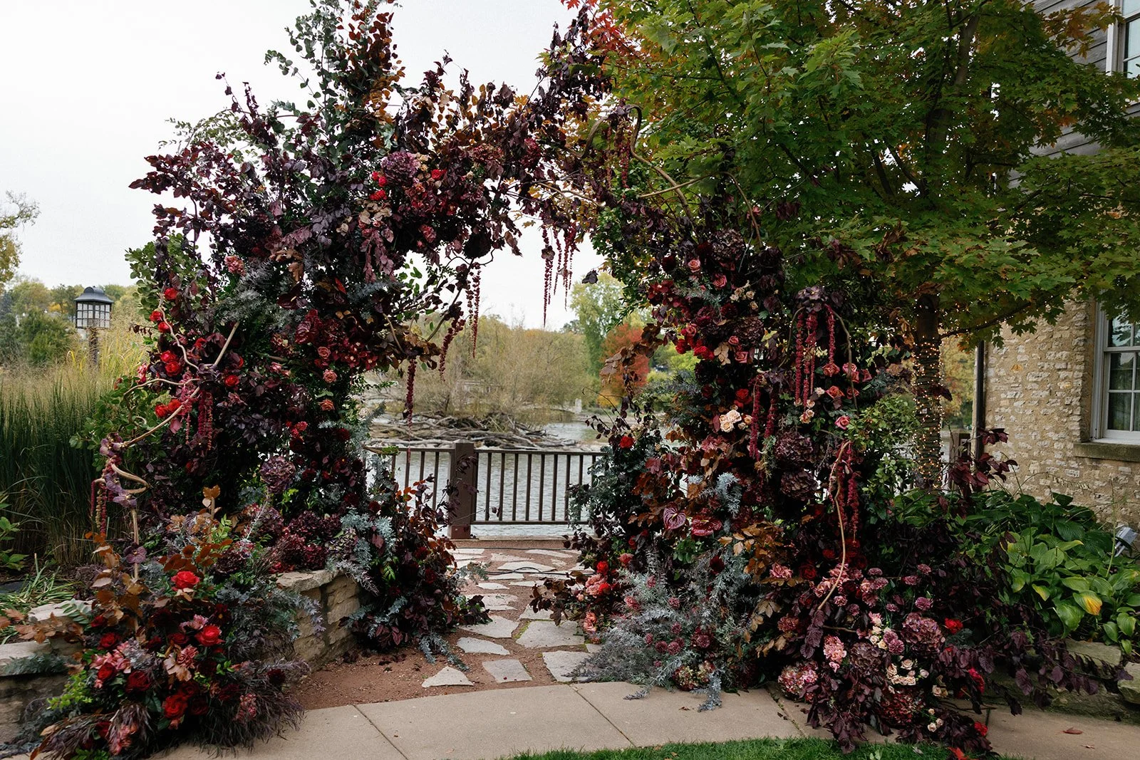 Meanwhile, the Life in Bloom team was building an incredible ceremony site in the Herrington Courtyard. When dreaming up the arch, we wanted it to feel like a magical backdrop, dripping with florals and surrounding the couple in winding vines and romantic blooms. This secret autumnal garden was a true showstopper, made even more enchanting with music from harpist Dawn Bishop.
