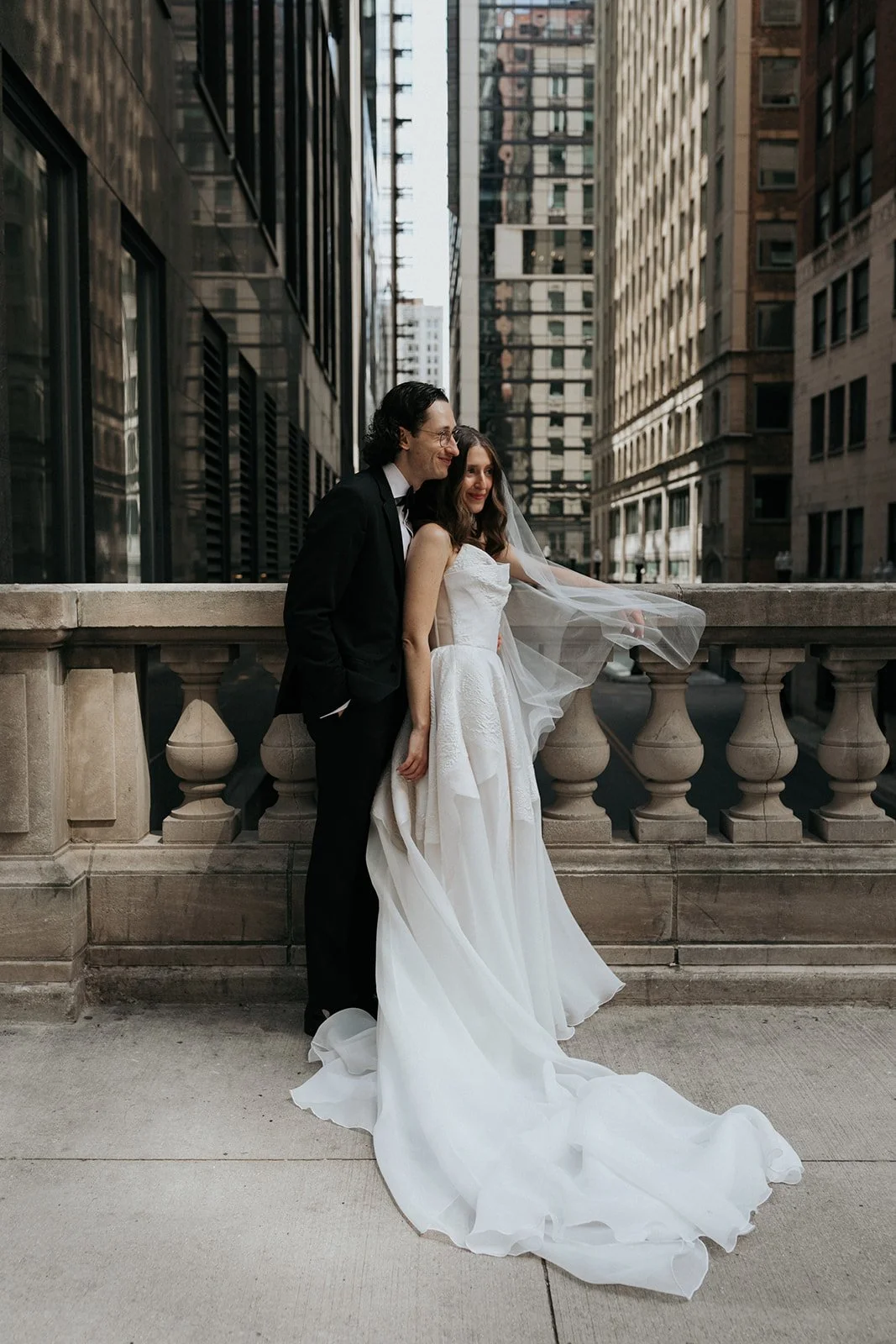 The stunning wedding party (THE DRESSES!!) joined the happy couple at the Board of Trade on a perfect summer day in Chicago. Tess opted to be the only one with a bouquet - a really fun new trend we’re seeing!